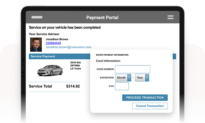Xtime Engage includes built-in service financing and payment options, allowing customers to approve repairs and pay directly in the service lane or online. Flexible financing helps increase customer approval rates for larger repairs, while integrated payment processing streamlines the entire checkout experience.